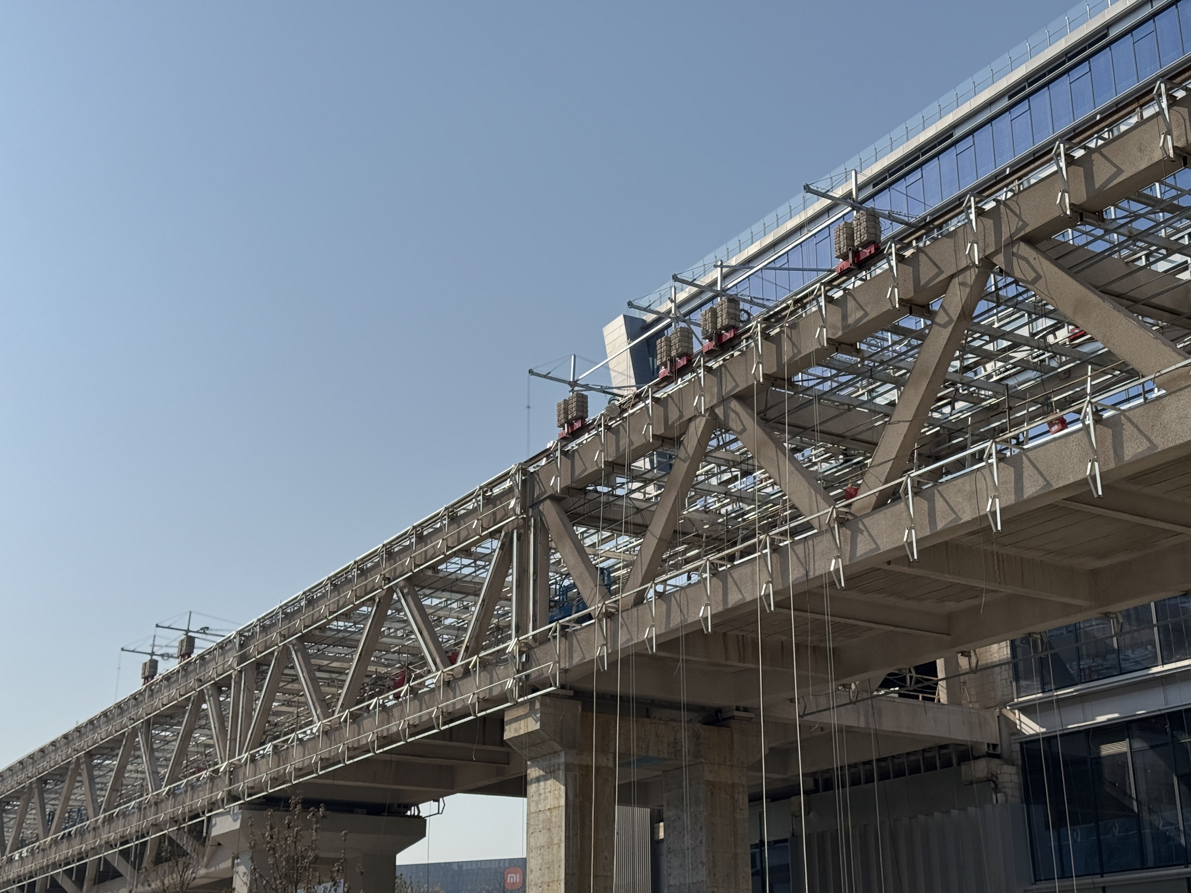 “廊桥的钢结构复杂,多种形状和规格的钢材交织,增加了加工与安装难度。另外,桁架的安装对精度的要求极高,特别是在地铁上盖有限的荷载条件下完成现场吊装作业,这对吊装设备和施工工艺提出了巨大考验,必须严格避免因吊装作业导致地铁结构开裂。所以说,地下城的建设难点不容小觑,天空之城的建设难度也肉眼可见,现场团队通过引入‘钢结构虚拟预拼装’‘DIC视觉监测’等先进技术,逐个攻克了施工中的难题。整个团队的全力以赴,确保了施工的质量与精度。”李为状说,整个建设周期从2023年6月持续到2024年12月,目前已全面进入廊桥外立面玻璃幕墙的装修工作。
